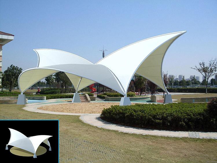 2、張力式膜結(jié)構(gòu):主要是利用簡(jiǎn)單的支撐系統(tǒng)及膜素材自身的張力特性組成的膜結(jié)構(gòu)。